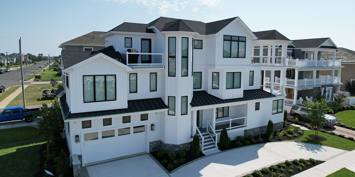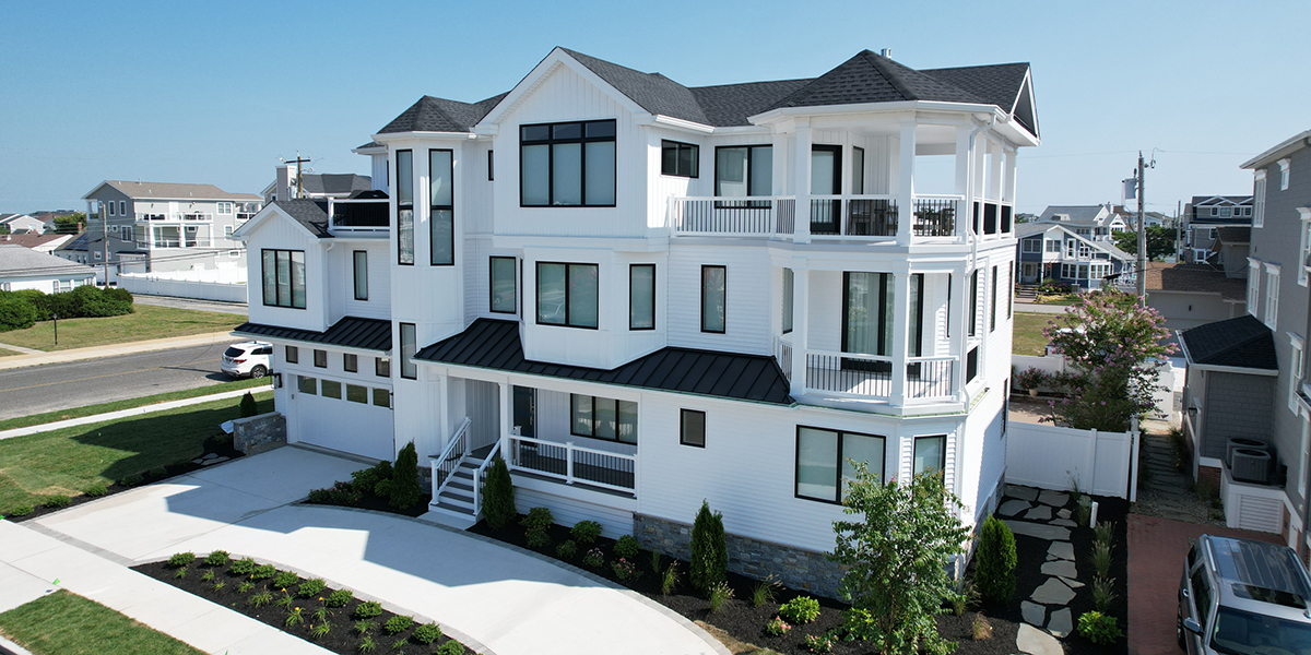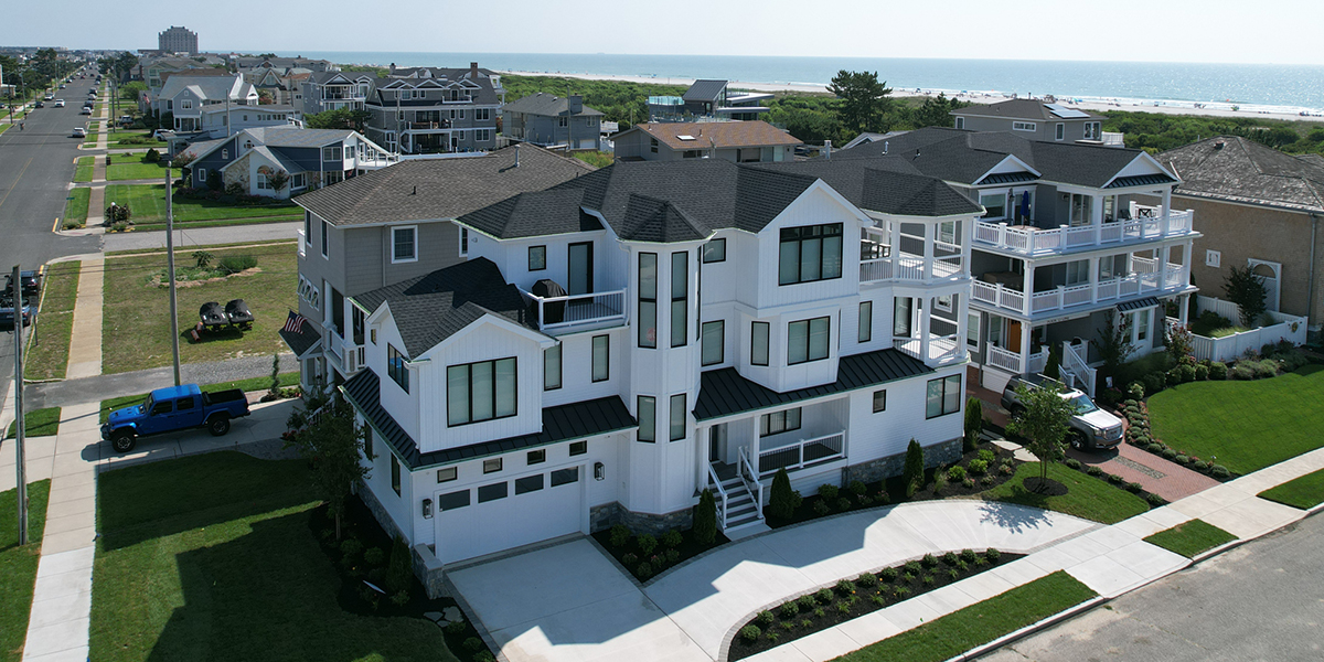 Back to Custom Shore HomesBrigantine narrow lot, 3,649 sq ft custom just a few steps to the beach. Challenging 27-ft deep home with 6-bedrooms, 4-1/2 baths and a study